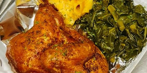 Crispy deep-fried golden 1/2 entire chicken seasoned to perfection w/ a hot honey garlic glaze. Served with three-cheese mac & flavorful greens